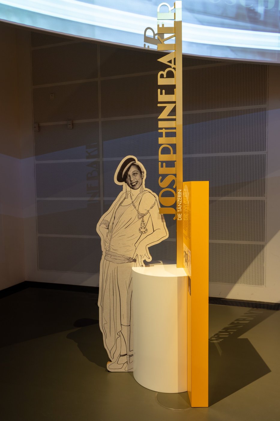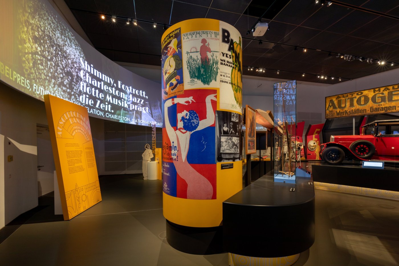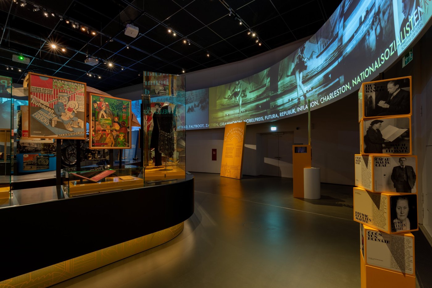Den Ausstellungssaal umspannt eine durchgehende Filmprojektion, es ist Bewegung pur, alles dreht sich um die zentral positionierten vier Themenbereiche. Wo man auch steht, man wird von bewegten Bildern begleitet. …Und selbstverständlich zieht sich die bahnbrechende Futura-Schriftfamilie des Paul Renner durch die gesamte Schau. Ein schwarzer „Laufsteg“ schlängelt sich durch die Mitte des Saales, alle Exponate stolzieren darauf; ob Flachware, Automobil oder Staubsauger, ob Grammophon oder Notgeld, ein langes "Schaufenster" der Objekte begleitet die Besucher*innen durch den Parcours. Der Anfang der Ausstellung wird als sich öffnender lichter Bereich gestaltet, …Hoffnung an eine neue Ära! Das Ende hingegen wird begleitet von zusammengestauchte, gefaltete, bedrohlich anmutende Wandpanele, …eine weltüberspannende Krise bahnt sich heran.