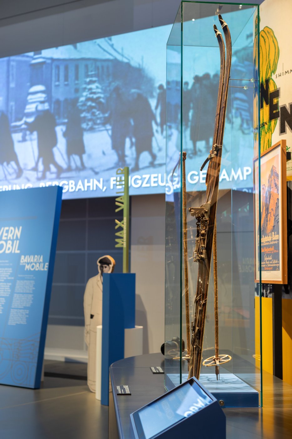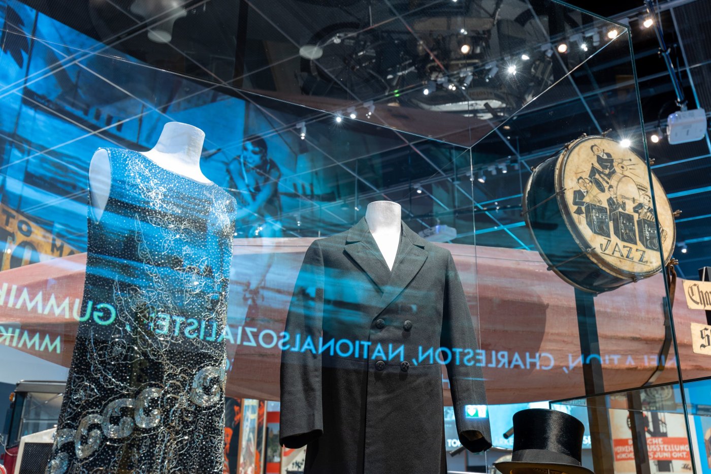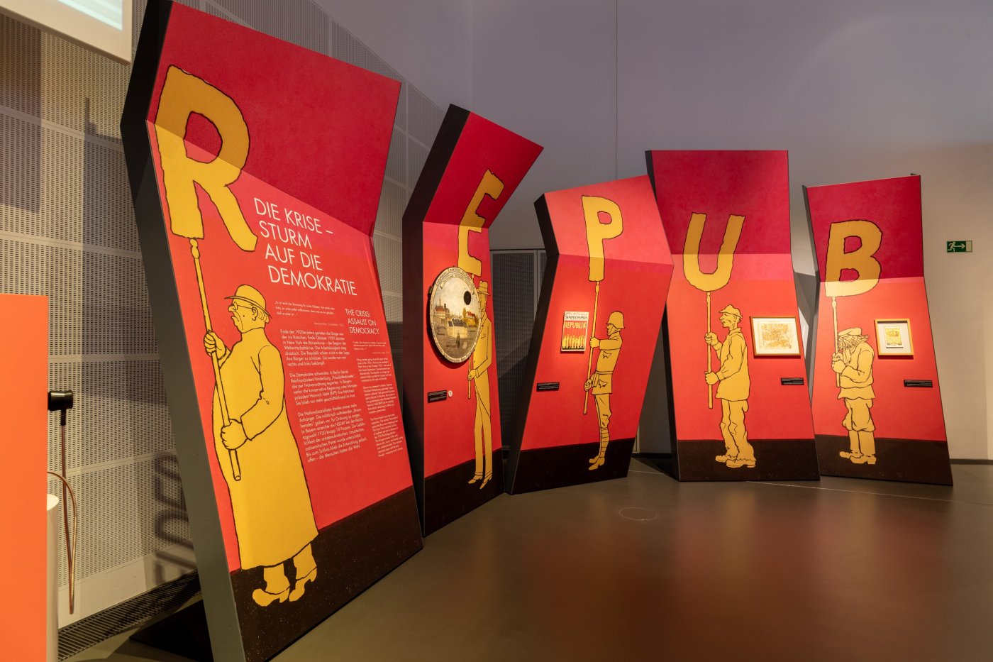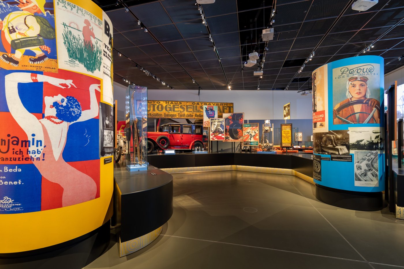 Den Ausstellungssaal umspannt eine durchgehende Filmprojektion, es ist Bewegung pur, alles dreht sich um die zentral positionierten vier Themenbereiche. Wo man auch steht, man wird von bewegten Bildern begleitet. …Und selbstverständlich zieht sich die bahnbrechende Futura-Schriftfamilie des Paul Renner durch die gesamte Schau. Ein schwarzer „Laufsteg“ schlängelt sich durch die Mitte des Saales, alle Exponate stolzieren darauf; ob Flachware, Automobil oder Staubsauger, ob Grammophon oder Notgeld, ein langes "Schaufenster" der Objekte begleitet die Besucher*innen durch den Parcours. Der Anfang der Ausstellung wird als sich öffnender lichter Bereich gestaltet, …Hoffnung an eine neue Ära! Das Ende hingegen wird begleitet von zusammengestauchte, gefaltete, bedrohlich anmutende Wandpanele, …eine weltüberspannende Krise bahnt sich heran.