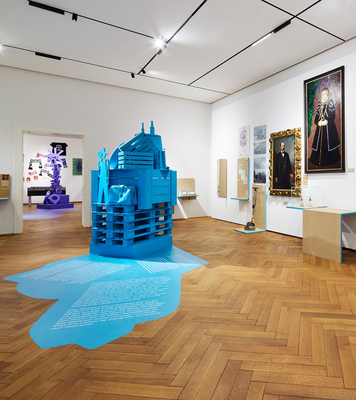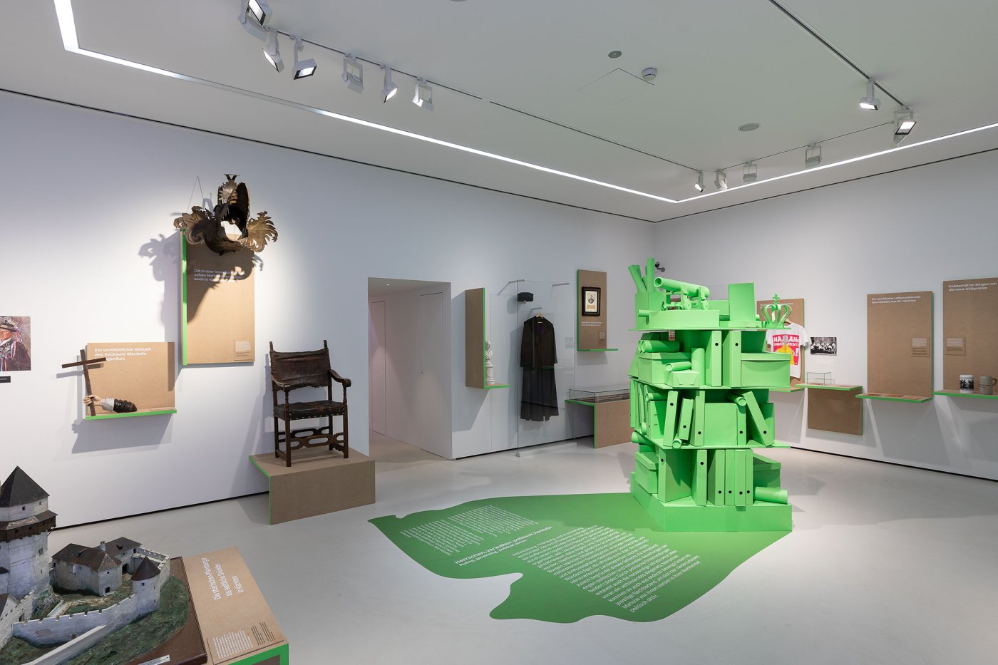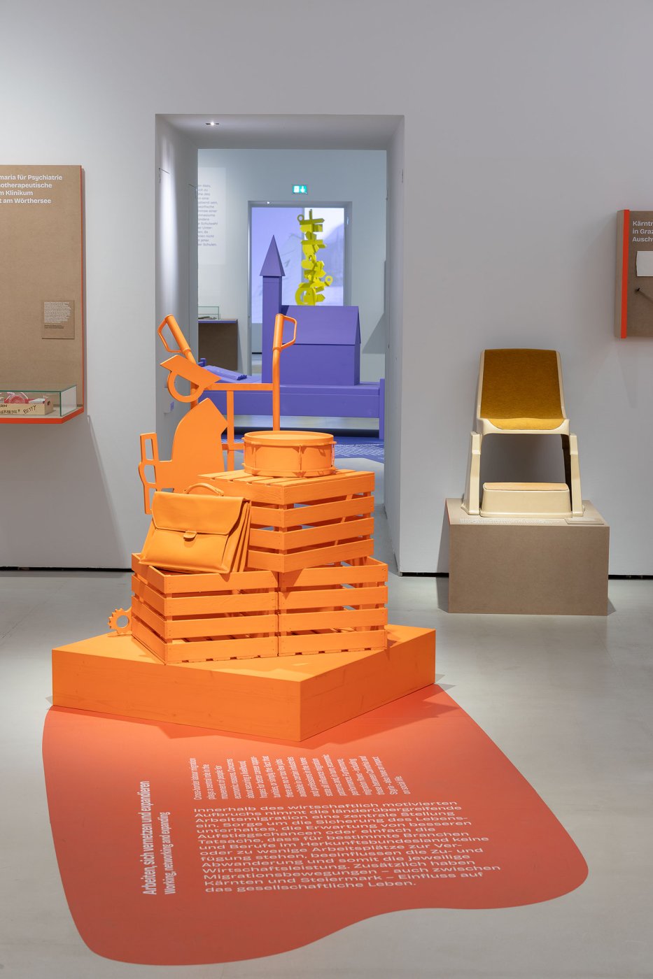 In ogni sala, una collage scultorea occupa un ruolo centrale, creando un contrappunto agli oggetti esposti e interpretando i temi dei vani. Colori vivaci conferiscono alla mostra un tocco contemporaneo.