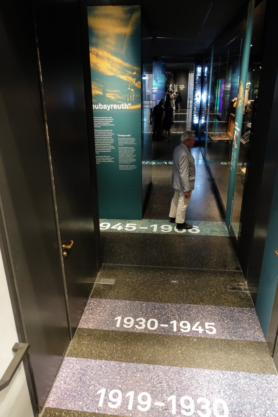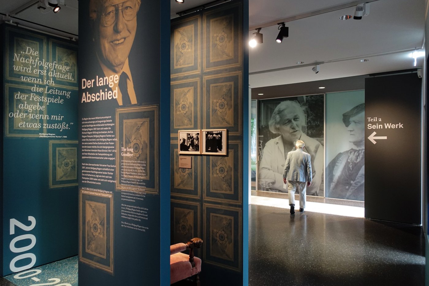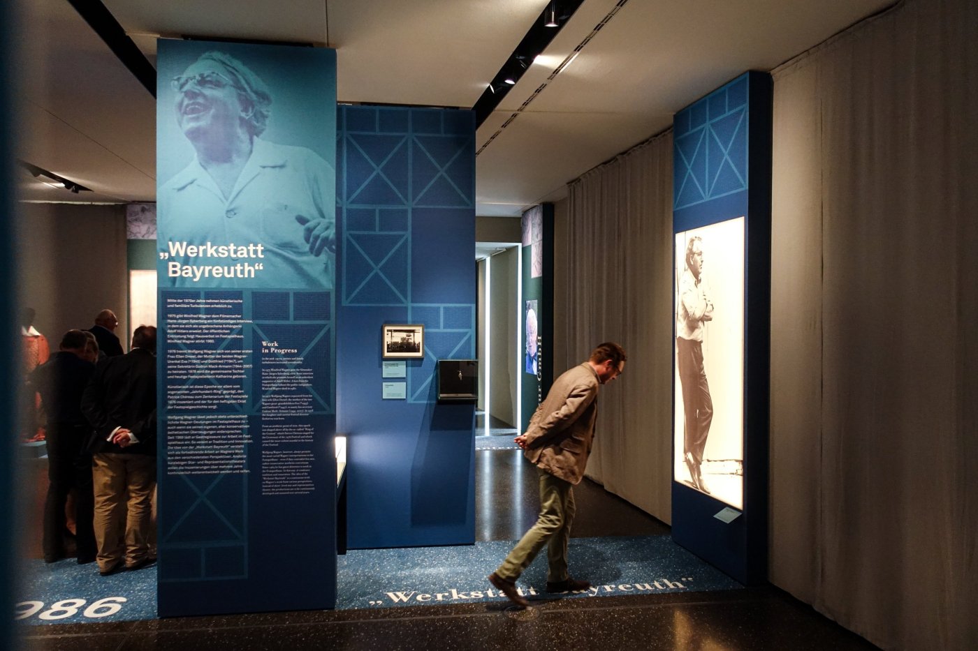 L'asse cronologico lineare che attraversa le stanze rappresenta l'affidabilità e l’abilità organizzativa di Wolfgang Wagner, il "padre classico" del teatro, con una struttura chiara dei temi della mostra. Gli assi trasversali, invece, fungono da finestre e specchi verso l’esterno e dall’esterno. Qui, influenze e contesti vengono messi in evidenza in modo puntuale.