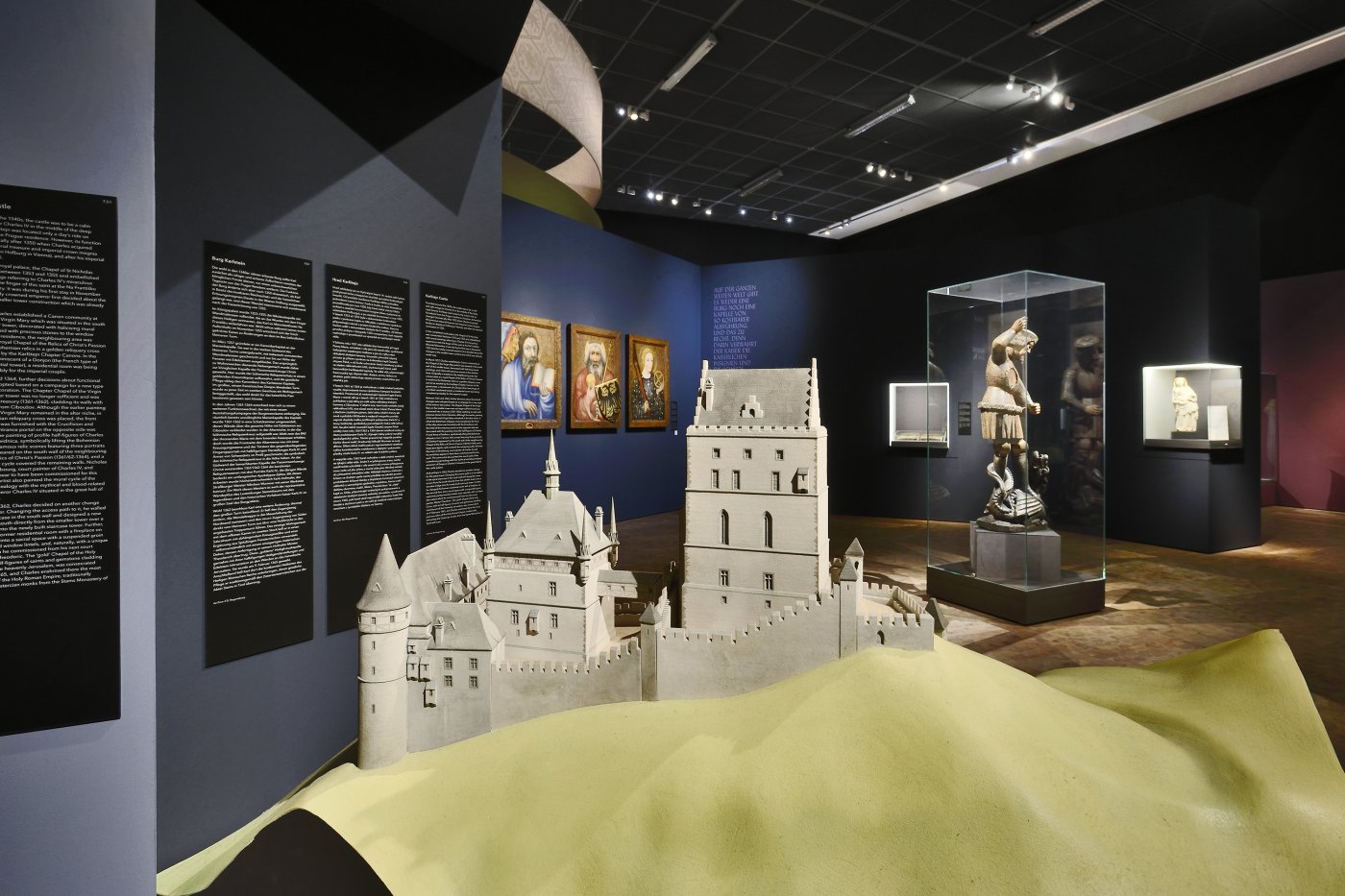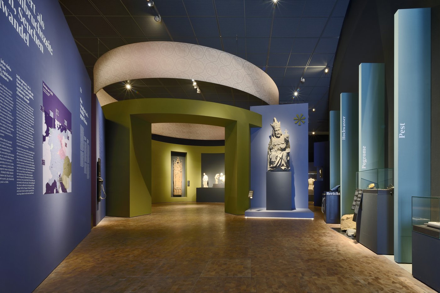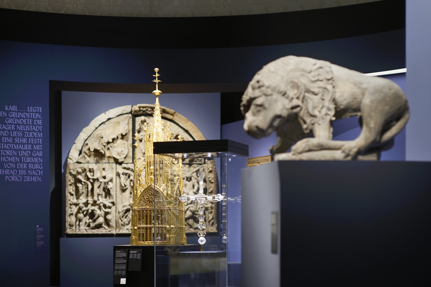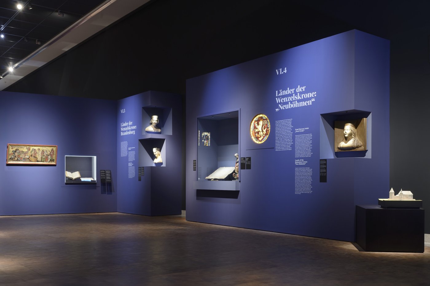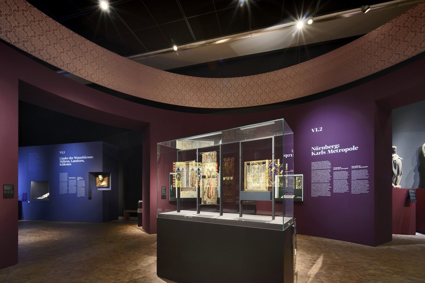 L'esposizione di questi pezzi unici e di inestimabile valore è concepita in modo da permetterne la piena fruizione. La grande sfida è presentare il materiale in modo che il visitatore, dopo aver attraversato 16 sezioni su una superficie di 1.000 mq, con un'illuminazione media di circa 100 lux, non lasci la mostra speciale affaticato. Il percorso deve rimanere coinvolgente, grazie a suddivisioni spaziali variabili, dalle sale cilindriche alle aree trapezoidali. Un itinerario chiaro, ma non rigidamente percepito, è accompagnato da spazi di sosta per i gruppi. Le diverse tonalità di colore delle singole sezioni (fino a quattro) aiutano a cogliere inconsciamente le sfumature tematiche. Corone cilindriche sul soffitto segnalano le tappe fondamentali della vita di Carlo IV. Coppie di citazioni con affermazioni contrastanti offrono uno spaccato sull'epoca e sull'operato dell'imperatore. Un passaggio provvisorio tra la grande sala espositiva (750 mq, altezza 7 m) e la seconda sala (250 mq, altezza 3,5 m) deve essere progettato in modo che il percorso non perda in coerenza e intensità. Tipografia, materiali cartografici, infografiche e design multimediale vengono armonizzati con grande attenzione all'elegante immagine dell'architettura espositiva, in uno stile moderno ma non effimero.
