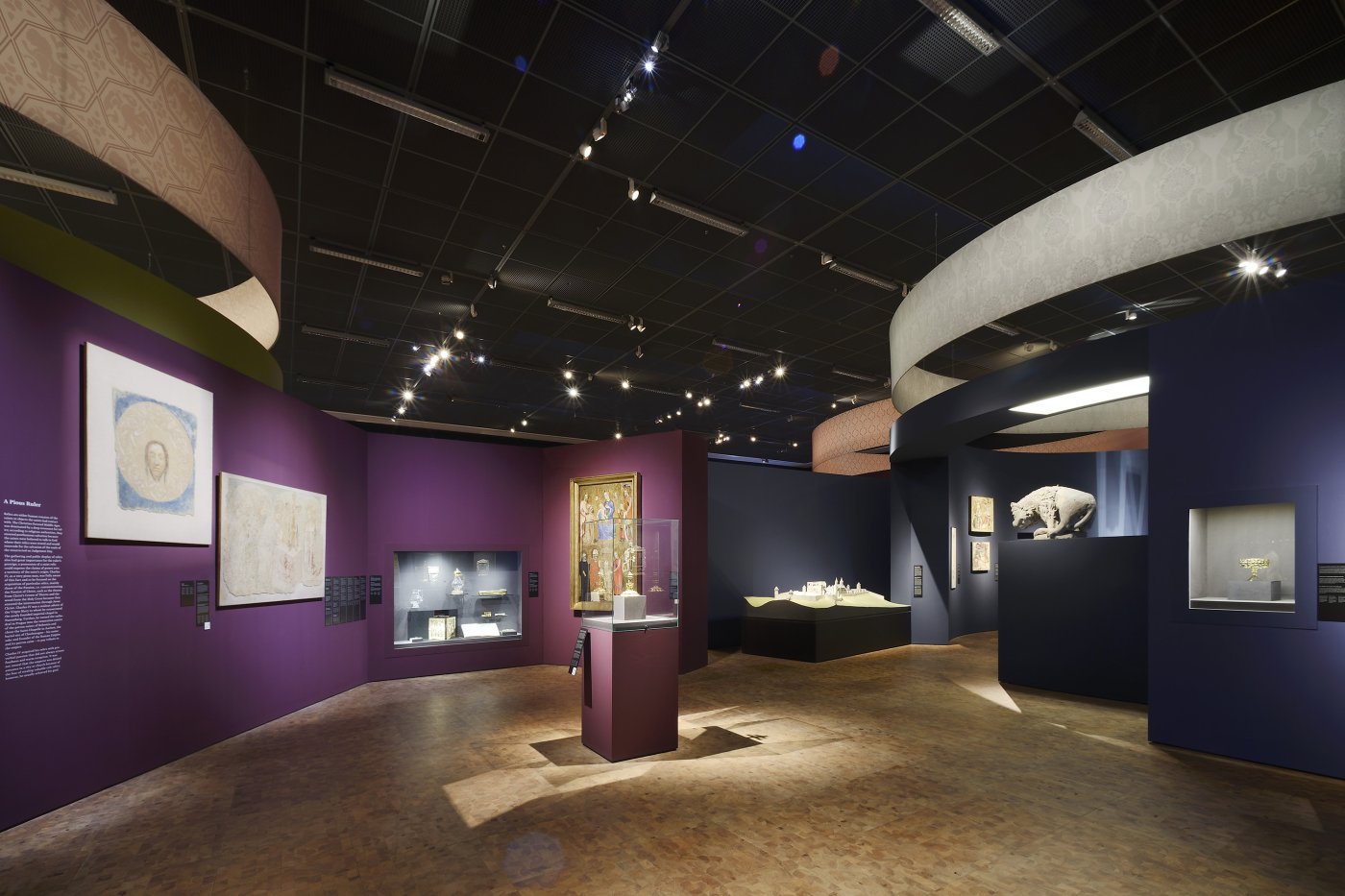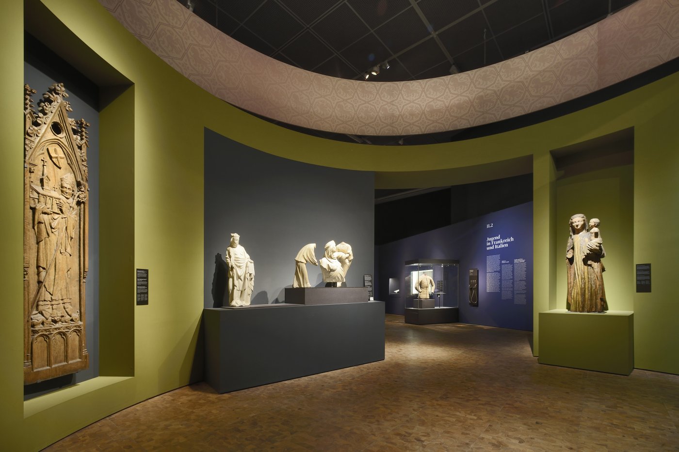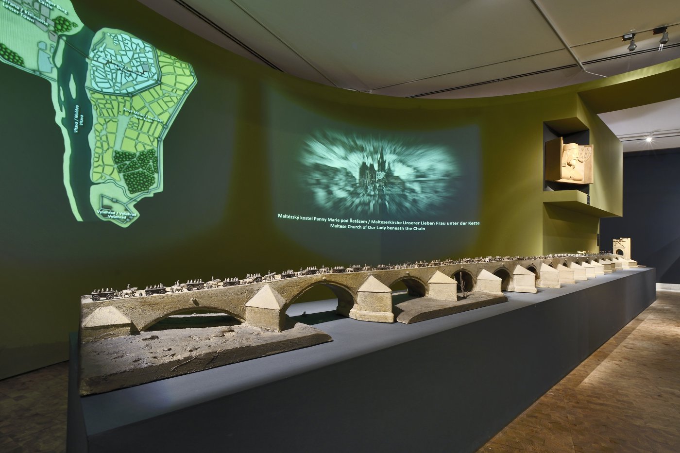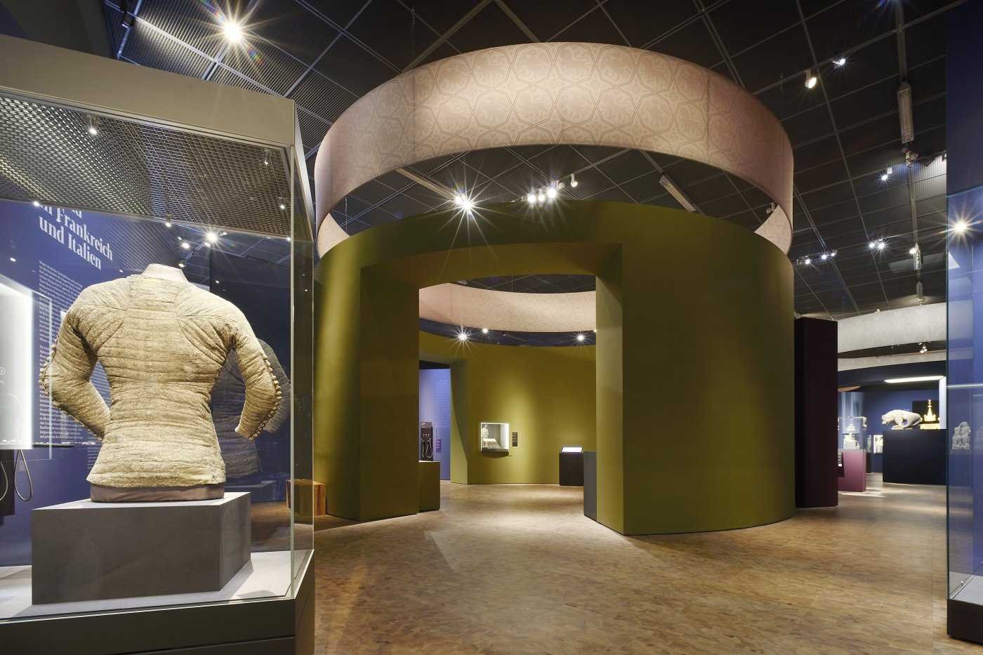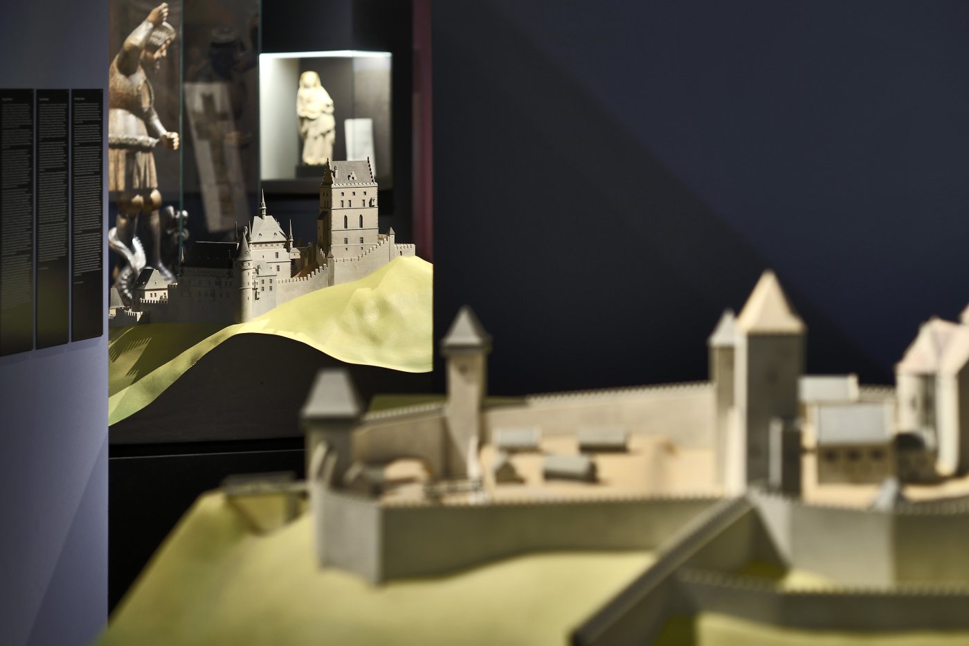 L'esposizione di questi pezzi unici e di inestimabile valore è concepita in modo da permetterne la piena fruizione. La grande sfida è presentare il materiale in modo che il visitatore, dopo aver attraversato 16 sezioni su una superficie di 1.000 mq, con un'illuminazione media di circa 100 lux, non lasci la mostra speciale affaticato. Il percorso deve rimanere coinvolgente, grazie a suddivisioni spaziali variabili, dalle sale cilindriche alle aree trapezoidali. Un itinerario chiaro, ma non rigidamente percepito, è accompagnato da spazi di sosta per i gruppi. Le diverse tonalità di colore delle singole sezioni (fino a quattro) aiutano a cogliere inconsciamente le sfumature tematiche. Corone cilindriche sul soffitto segnalano le tappe fondamentali della vita di Carlo IV. Coppie di citazioni con affermazioni contrastanti offrono uno spaccato sull'epoca e sull'operato dell'imperatore. Un passaggio provvisorio tra la grande sala espositiva (750 mq, altezza 7 m) e la seconda sala (250 mq, altezza 3,5 m) deve essere progettato in modo che il percorso non perda in coerenza e intensità. Tipografia, materiali cartografici, infografiche e design multimediale vengono armonizzati con grande attenzione all'elegante immagine dell'architettura espositiva, in uno stile moderno ma non effimero.