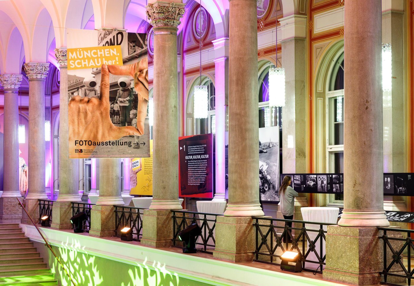 L'obiettivo dell'allestimento era di creare una mostra speciale all'interno di questi straordinari e ampi spazi, con mezzi modesti ma in modo divertente e accattivante. Si desiderava attrarre un nuovo pubblico, passando dal tono classico e maestoso a una forma di presentazione più vivace e innovativa, senza tuttavia escludere i visitatori abituali. Entrando nella "StaBi" (Biblioteca Statale), la mostra speciale doveva colpire immediatamente l'attenzione. Per questo è stata "promossa" non solo nella galleria dello scalone, ma anche "esposta" fin dall'ingresso.