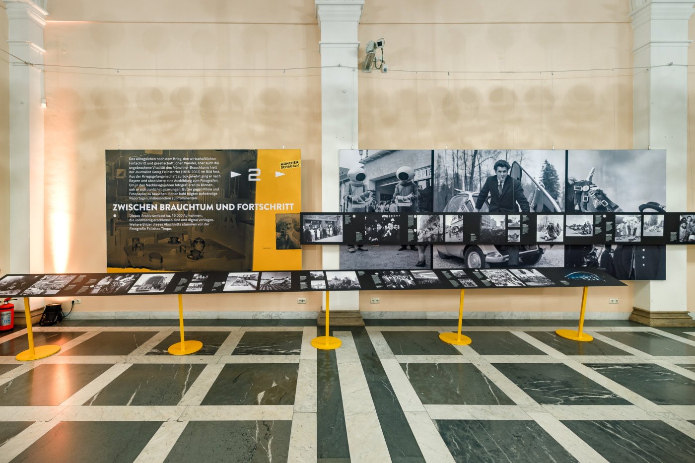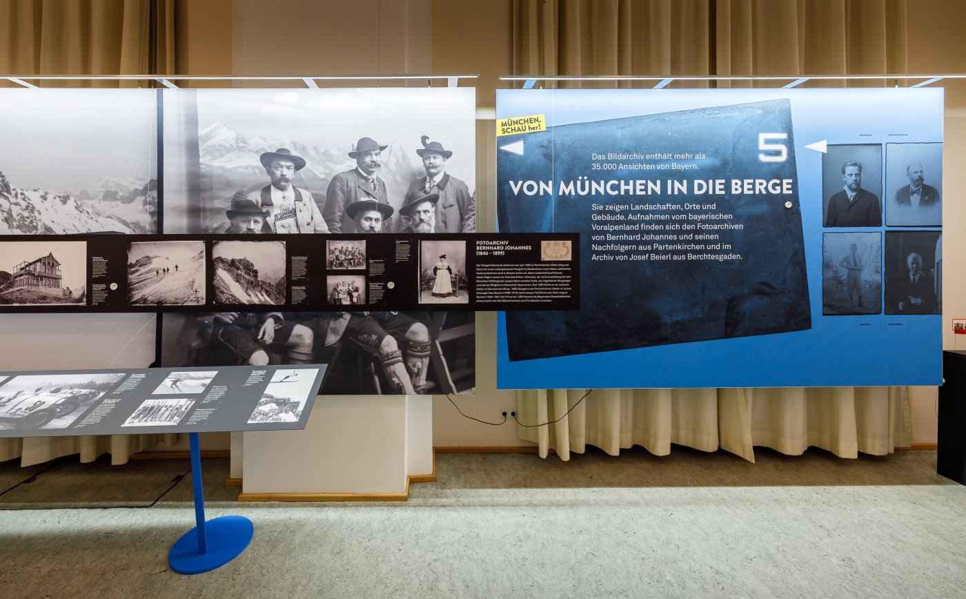 La sfida era presentare le numerose fotografie in modo ampio e piacevole; sfogliarle come in un grande libro sarebbe stato interessante ma stancante. Proiezione? Escluderebbe un'osservazione individuale. Stampa su tessuto? Non avrebbe offerto la qualità di stampa desiderata e sembrerebbe una bacheca. Perciò, ci è sembrato che un’esposizione in sequenza, simile a quella di una galleria d'arte tradizionale, fosse la soluzione migliore. Il visitatore può scegliere il proprio ritmo di osservazione. Abbiamo utilizzato i pannelli esistenti del sistema Procedes per i testi tematici e le grandi immagini, fungendo da elementi scenici e iconici! Per la presentazione degli "esemplari" – le fotografie – abbiamo utilizzato supporti sospesi e metallici a forma di mensole strette e allungate. Questi pannelli prolungati indicano in modo discreto e invitante la direzione del percorso, fino al punto culminante della mostra nelle due camere del tesoro, dove gli originali più preziosi fanno battere più forte il cuore del visitatore.